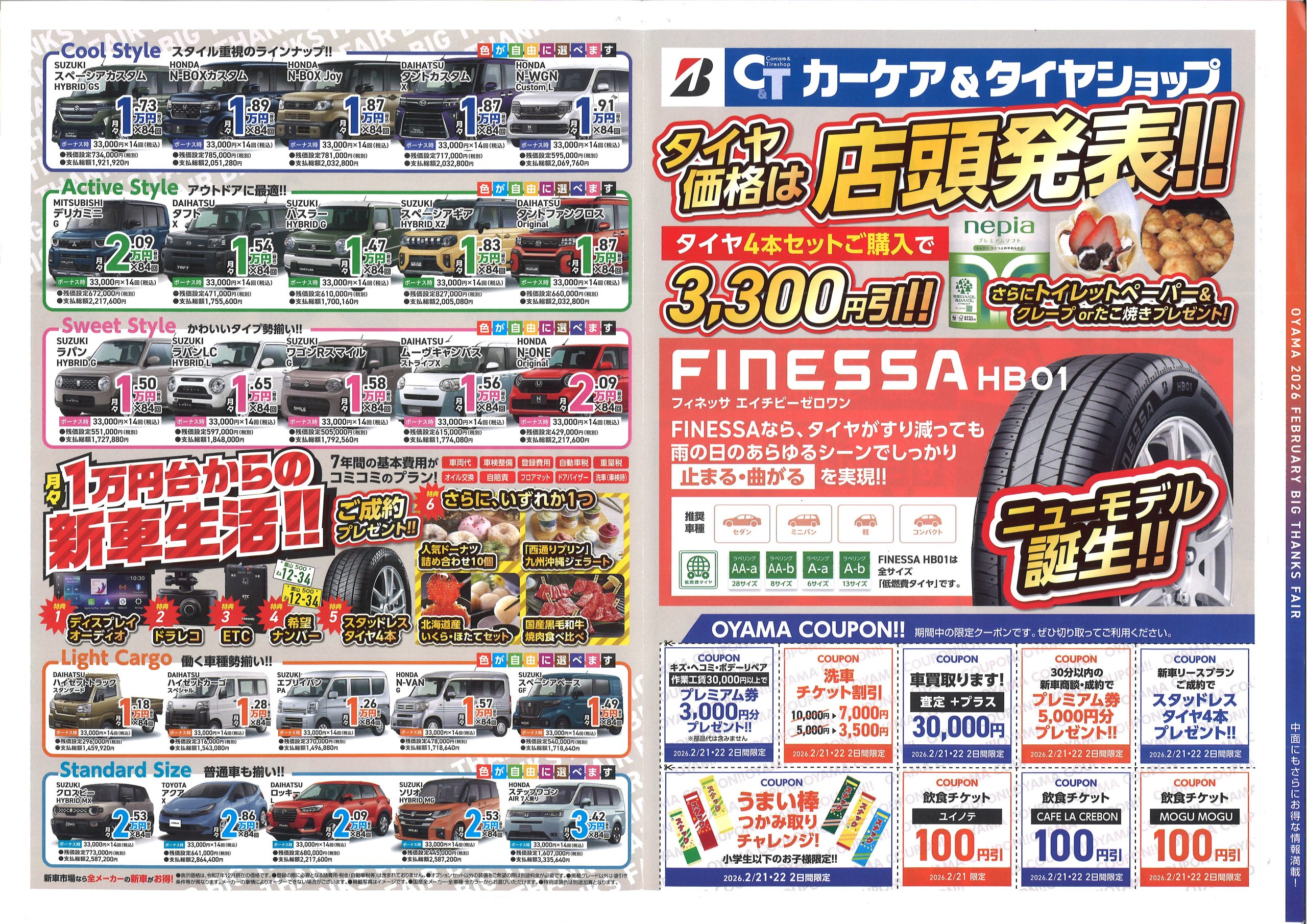 2026.02.10 2026.2/21・22 ★大感謝祭★ 2026年も大感謝祭を開催いたしま~す★ このDMが届いている方は、必ずお持ちくださいね‼ ★日頃の感謝をオイル交換で ★ブリヂストンタイヤ ~ニューモデル発売~『フィネッサ』 ★振る舞い鍋でおもてなし ★人気のキッチンカーも大集合 などなど、大~変お得な2日間となっております‼ ぜひぜひ皆様のご来店をお待ちしております‼ 一覧をみる トップページへ