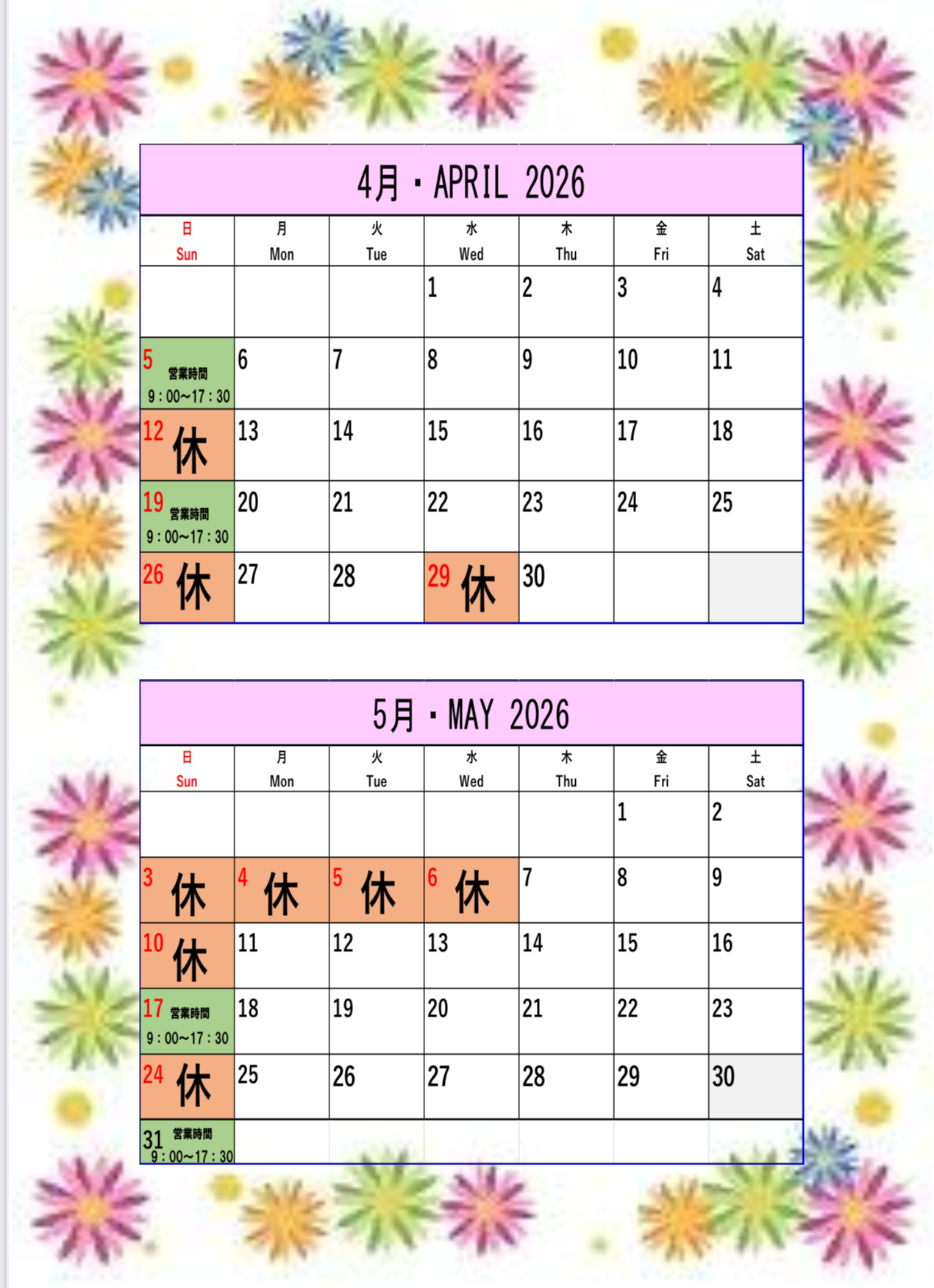 平日/9:00~18:30 日曜/9:00~17:30
