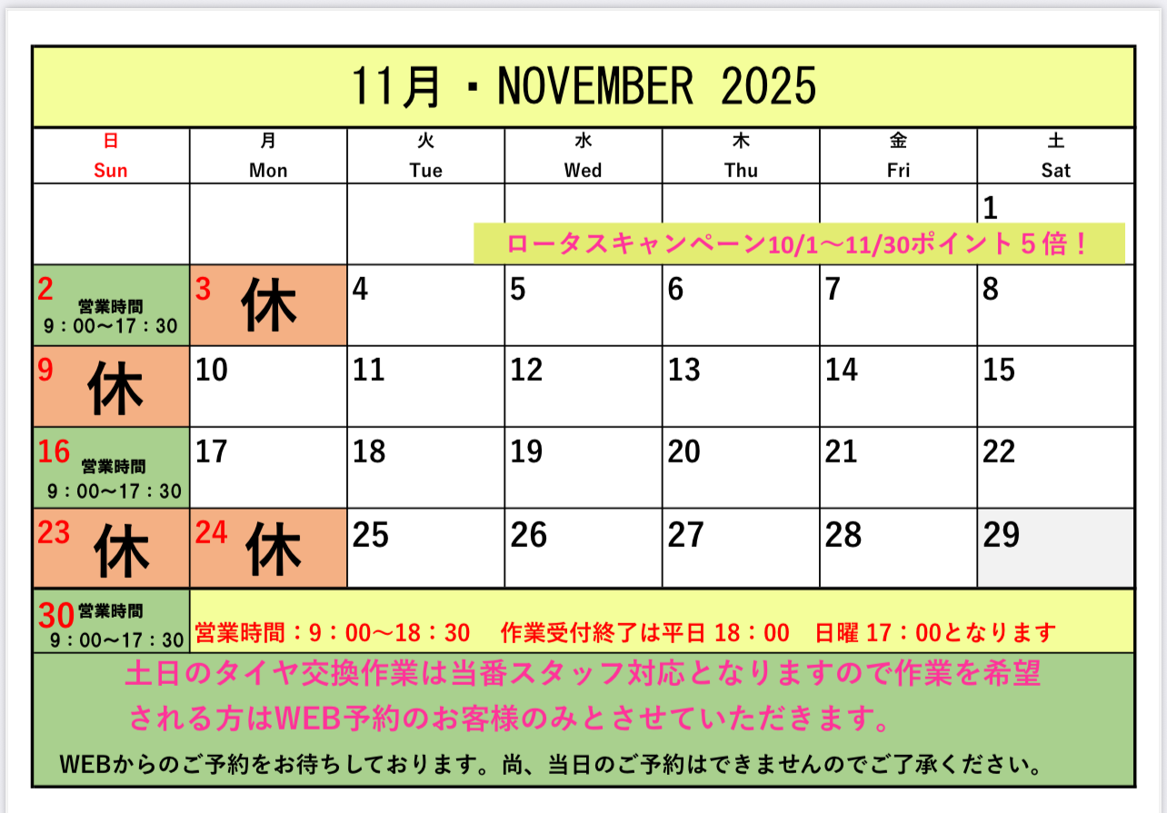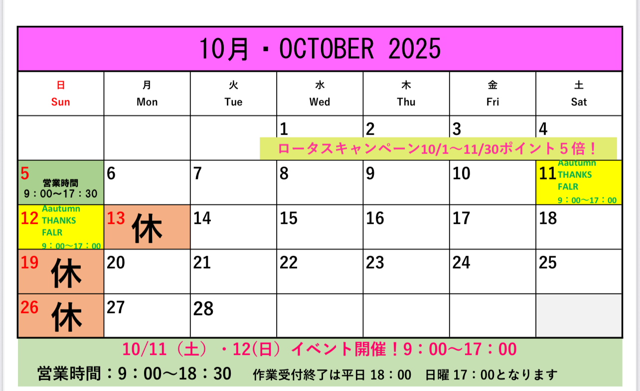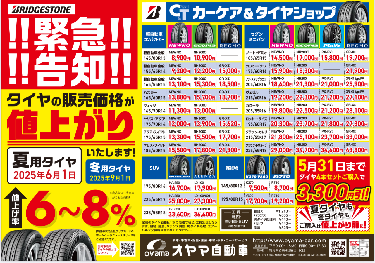 おすすめイベント情報の一覧です。クリックすると、詳細がご覧になれます。 11月営業のご案内 ★OYAMA Autumn THANKS FAIR★10/11・12 10月営業のご案内 9月営業のご案内 8月営業のご案内 7月営業のご案内 メンテナンスコーティング料金改定のご案内 6月営業のご案内 !!緊急告知!!6月1日よりタイヤの価格が値上がりします!!!!緊急告知!!6月1日よりタイヤの価格が値上がりします!! 5月営業のご案内 4月営業のご案内 3月営業のご案内 Page 1 of 512›»